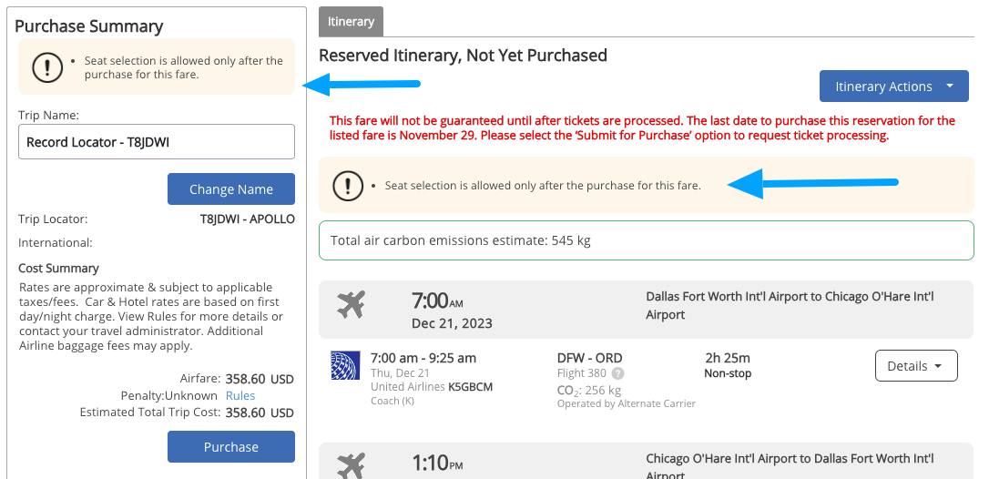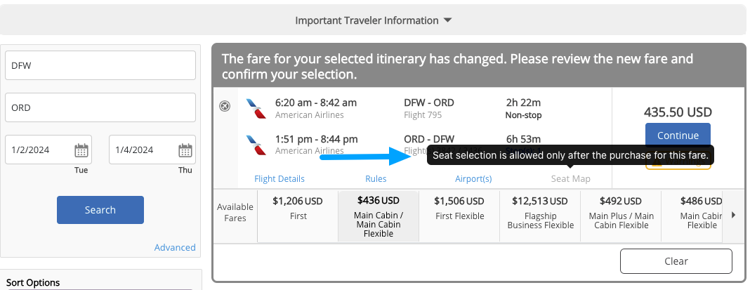 When a user selects a Specialty Fare (NDC option), the tool will let them know when they can choose a seat.