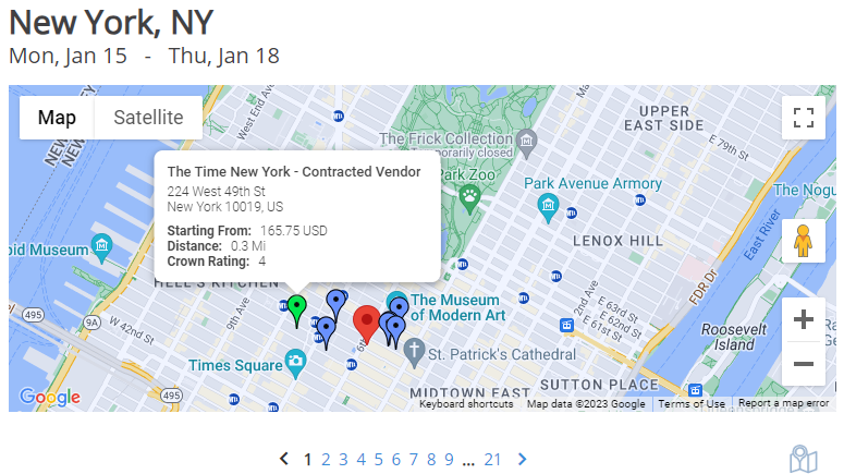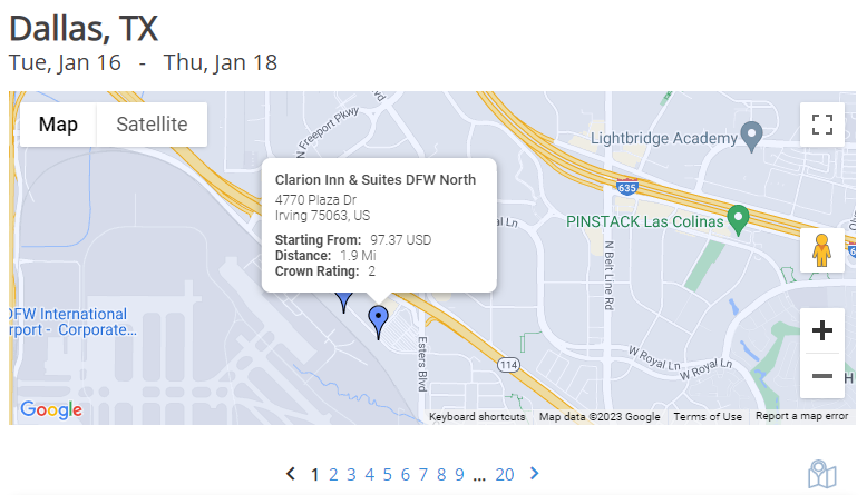 When selecting a property on the map, the page will scroll to that hotel in the results list.