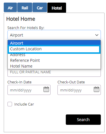 Custom location is now a separate search option in the "Search for hotels by" dropdown menu. Users can now directly select a custom location instead of enabling it under the Airport option. The changes improved usability by separating distinct search choices into their menu items.