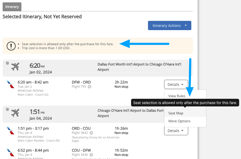 If the user clicks on Seat Map, the tool will advise them on when they may select a seat.