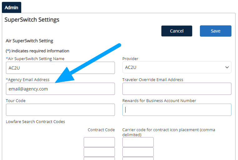 The agency email address is now required in Airline SuperSwitch Settings when booking with Air Canada using Air Canada Direct Connect (ACDC). The airline booking workflow will need an email to be added in the Airline SuperSwitch Settings before booking Air Canada flights via ACDC. Email validity cannot be automatically verified. Travel arrangers will need to ensure a valid agency email is appropriately configured.