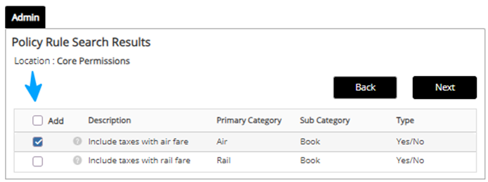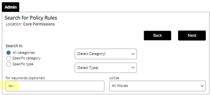 4. Use ‘tax’ in keywords to search for policy rules and click Next.